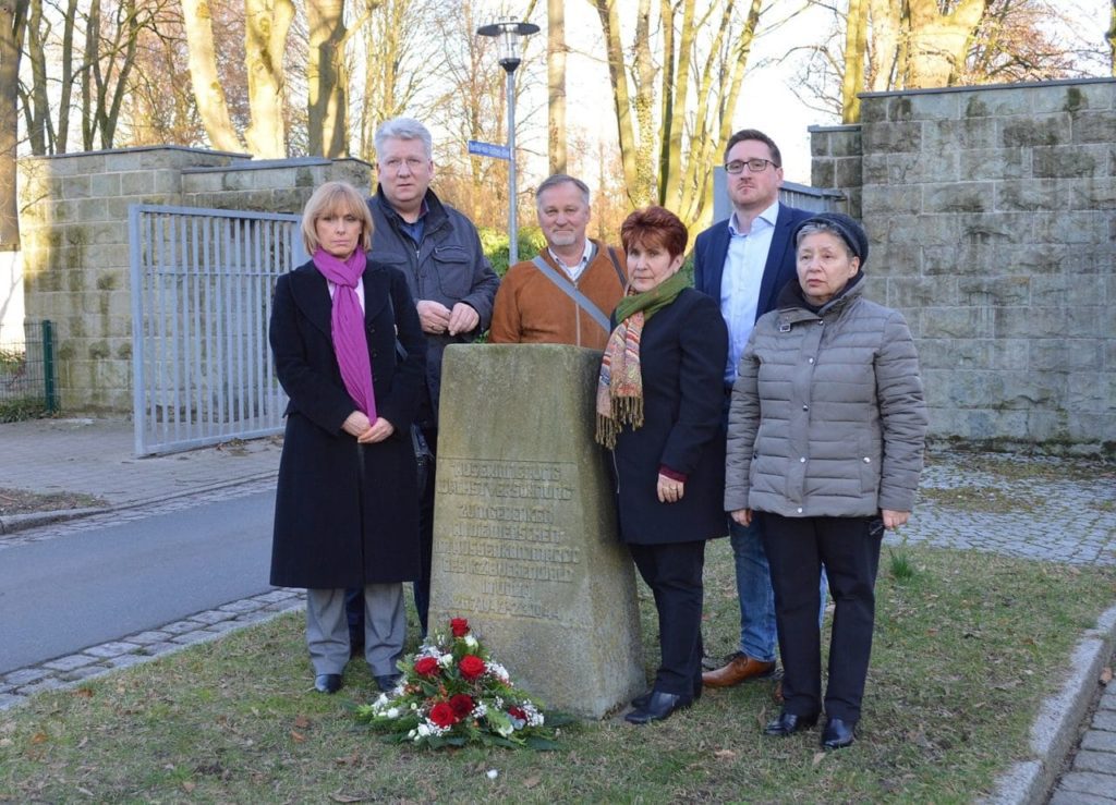 „Nur, wer die Vergangenheit kennt, kann Lehren aus ihr ziehen“ Erinnerung an das KZ-Außenkommando Buchenwald in Unna 1. März 2019 Foto: Ksenija Sakelsek (1. v.l.), Hartmut Ganzke (2. v.l.) Alexandra Khariakova (4. v.l.) und Sebastian Laaser (5. v.l.) erinnerten zusammen mit weiteren Vertretern der Jüdischen Gemeinde an die Schließung des KZ Außenkommandos Buchenwald in Unna. In dieser Woche legten die Vorsitzende des Unnaer Integrationsrats, Ksenija Sakelsek, die Vorsitzende der Jüdischen Gemeinde im Kreis Unna, Alexandra Khariakova, der SPD-Landtagsabgeordnete Hartmut Ganzke und der SPD-Stadtverbandsvorsitzende Sebastian Laaser mit weiteren Vertretern der Jüdischen Gemeinde ein Gesteck am Gedenkstein in der Bertha-von-Suttner-Allee ab. Sie erinnerten damit an einen Jahrestag der nicht jedem im Gedächtnis blieb. Es war am 2. März vor 75 Jahren, da endete ein dunkles Kapitel in Unnas Geschichte: Das am 26. Juli 1943 eingerichtete Außenkommando des Konzentrationslagers Buchenwald auf dem Gelände der damaligen SS-Kaserne (später Hellweg-Kaserne) wurde geschlossen. 50 politische Häftlinge wurden hier für Baumaßnahmen auf dem Kasernengelände und in der Innenstadt eingesetzt. Foto: Ksenija Sakelsek (1. v.l.), Hartmut Ganzke (2. v.l.) Alexandra Khariakova (4. v.l.) und Sebastian Laaser (5. v.l.) erinnerten zusammen mit weiteren Vertretern der Jüdischen Gemeinde an die Schließung des KZ Außenkommandos Buchenwald in Unna. 1990 hatte der Bildungsverein Kreis Unna e.V. unter dem Vorsitz von Hartmut Ganzke die Geschichte des Außenkommandos erforscht und in der Broschüre „…sie trugen eine blau-weiß gestreifte Sträflingsuniform…“ zusammengestellt. „Nur, wer die Vergangenheit kennt, kann Lehren aus ihr ziehen“, waren sich die Anwesenden einig und nannten als gutes Beispiel die Art wie in Unna der Gedenktag zu Auschwitz-Befreiung begangen wird. 1994 hatte die Stadt Unna auf Anregung des Bildungsvereins vor dem damaligen Offiziersheim in der Kaserne einen Gedenkstein aufgestellt, der eigens von Carlernst Kürten gestaltet wurde. Nach dem Abriss der Kasernengebäude und dem Ende der Bebauung des Wohnparks Unna-Süd hat der Stein seit dem 11. April 2006 einen neuen Platz an der Bertha-von-Suttner-Allee gefunden.